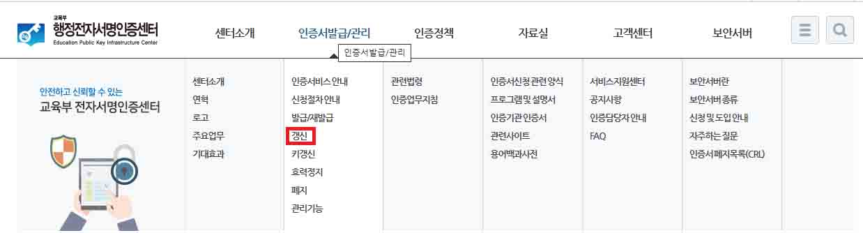 아래처럼 인증서발급/관리 -> 갱신을 클릭하시면 됩니다.