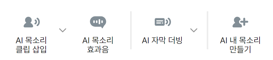 AI 목소리 탭입니다. Vrew의 차별점 중 하나라고 볼 수 있는 탭인데요, AI 목소리 삽입 더빙 등을 할 수 있습니다.
