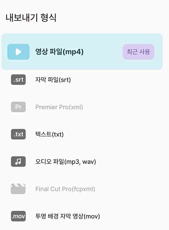 자막, 텍스트, 오디오 이미지 파일 등으로 내보낼 수 있을 뿐만 아니라, 영상 편집 프로그램에서 전문적으로 편집할 수 있도록, 프리미어, 파이널컷, 다빈치 프로 등 형식으로 내보낼 수 있습니다.