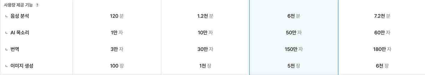 무료 요금제는 음성 분석 120분, 1200분, 6천 분 순, AI 목소리 1만 자, 10만 자, 50만 자입니다.