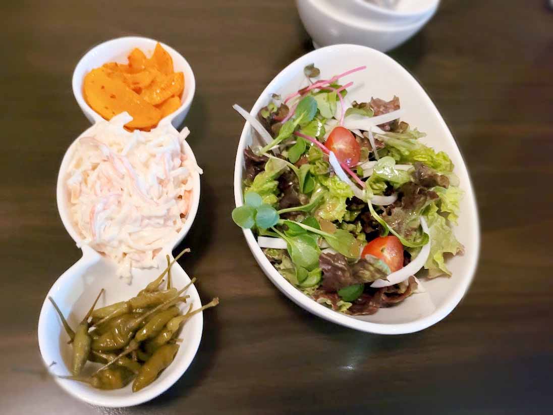 기본찬에는 샐러드, 할라피뇨, 매운 단무지, 마요네즈 버무린 샐러드가 나옵니다.