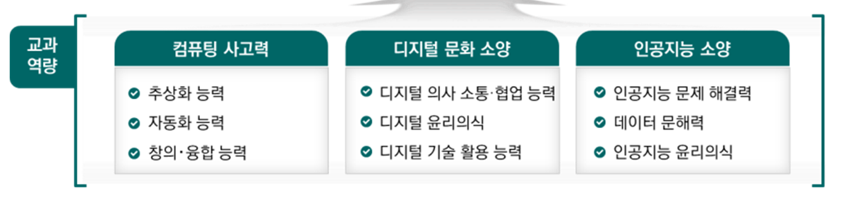 정보 교과역량 3가지 컴퓨팅 사고력, 디지털 문화 소양, 인공지능 소양을 묻는 질문이네요!