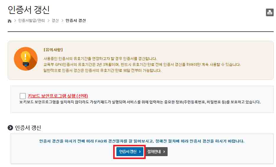 여기서 파란 버튼 인증서 갱신을 클릭하시면 됩니다!