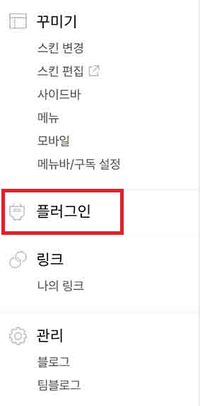 네이버 서치 어드바이저 창을 끄지 말고, 이제 티스토리 블로그에 들어가 설정 창에서 플러그인에 들어가 주세요.