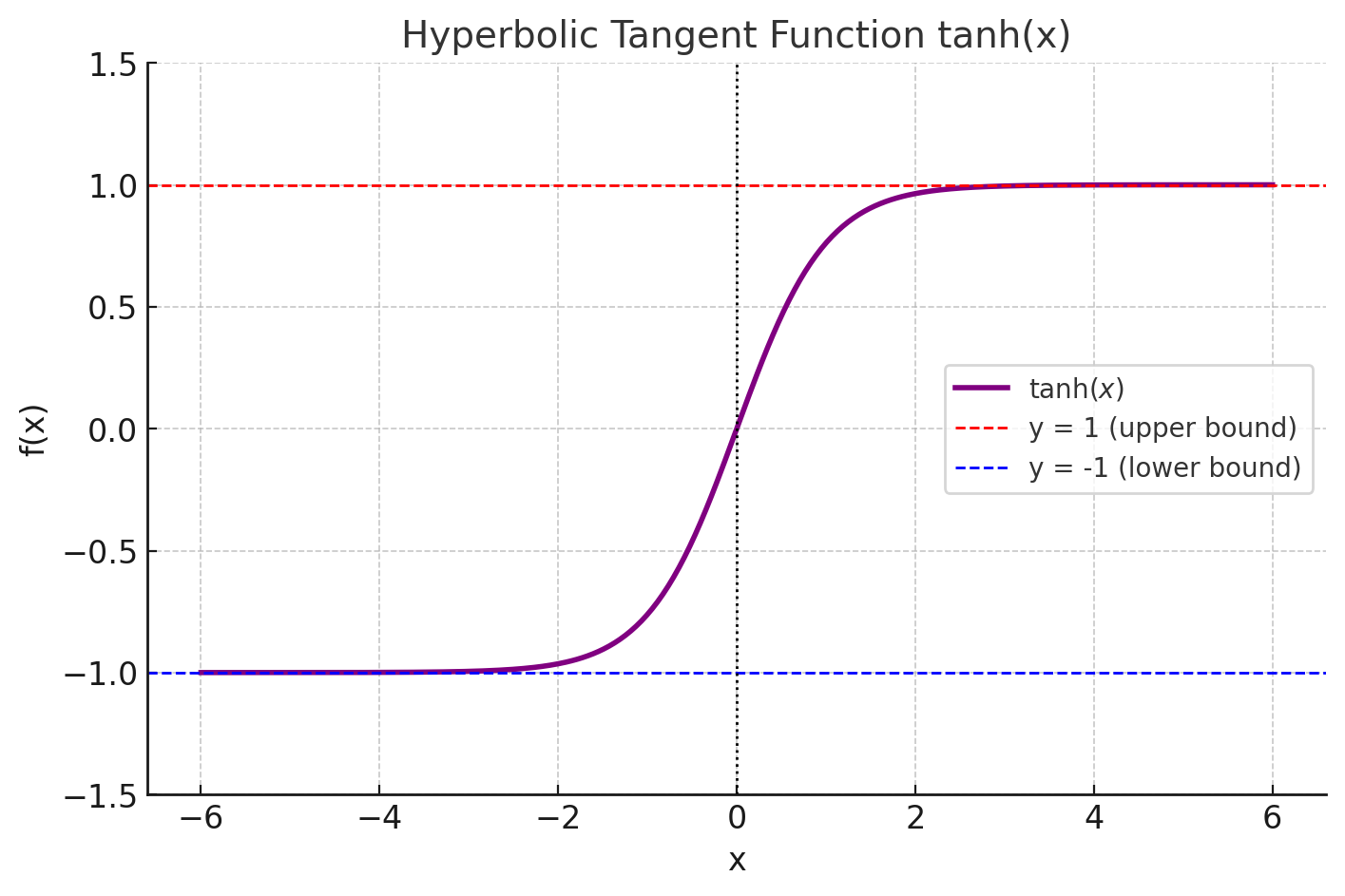 하이퍼볼릭 탄젠트 함수는 입력값을 -1과 1 사이의 값으로 압축하는 S자 형태의 비선형 함수입니다.