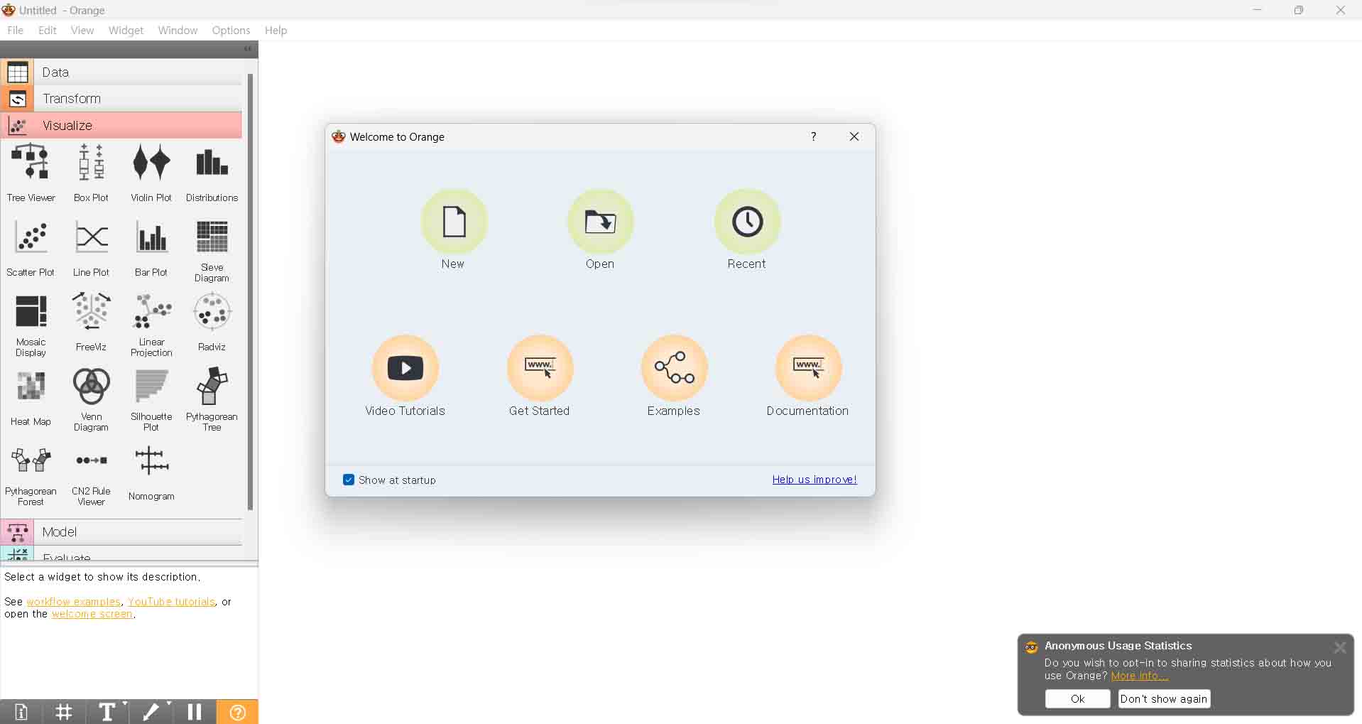 Orange3를 설치 완료하면 다음과 같은 화면이 뜹니다.