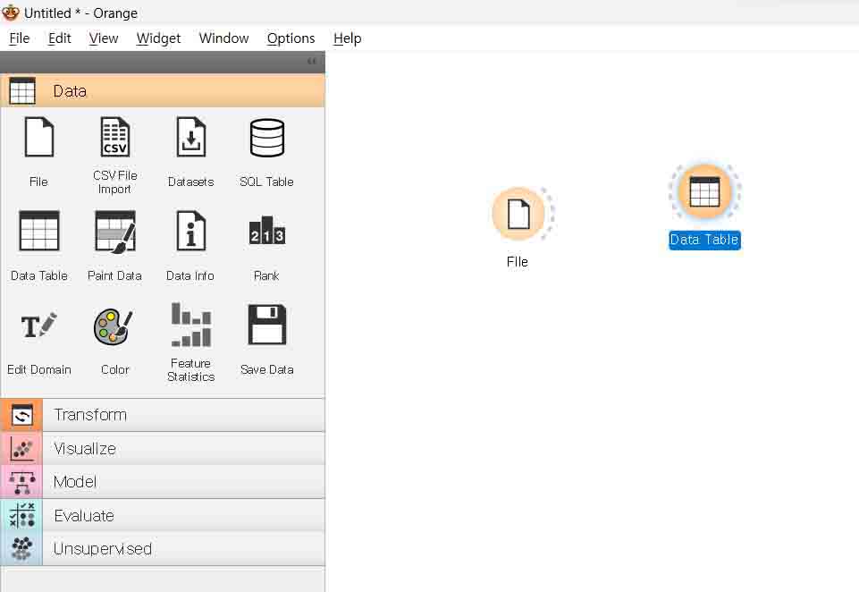 Orange3는 드래그 위젯에 있는 아이콘을 캔버스로 드래그하면 되는 간단한 방식으로 되어 있습니다.