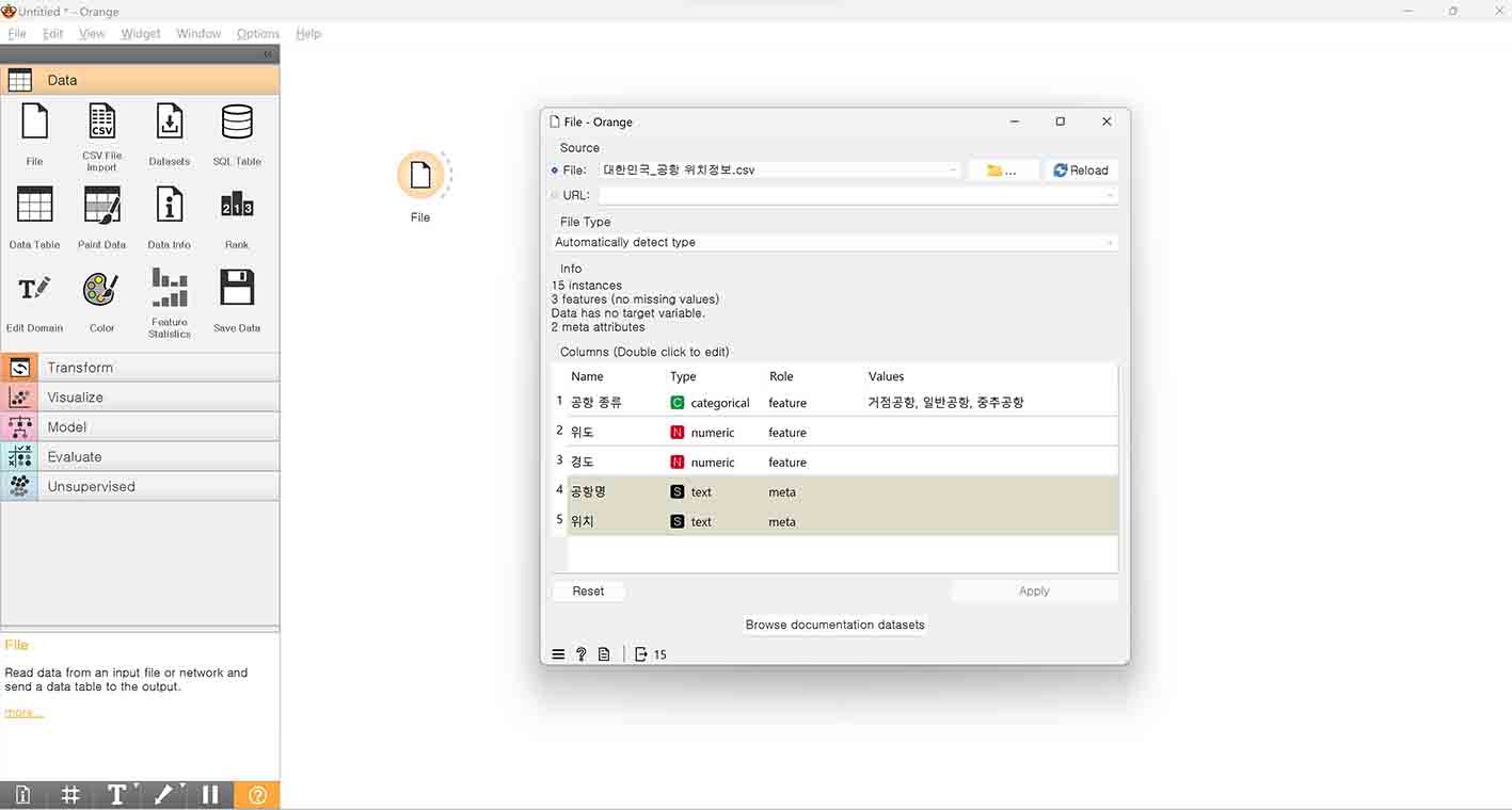 Orange3에서 데이터 형식을 저절로 인식하여 설정한 것입니다. 기본적으로 인식되나, 만약 데이터 형식의 성격이 맞지 않다면 바꿔줄 수도 있습니다~.