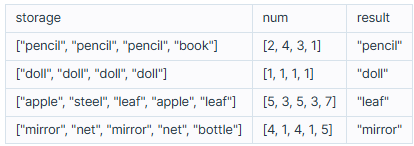 창고를 정리하면 clean_storage = ["mirror", "net", "bottle"], clean_num = [8, 2, 5]가 됩니다. 따라서 가장 개수가 많은 물건인 "mirror"를 return합니다.