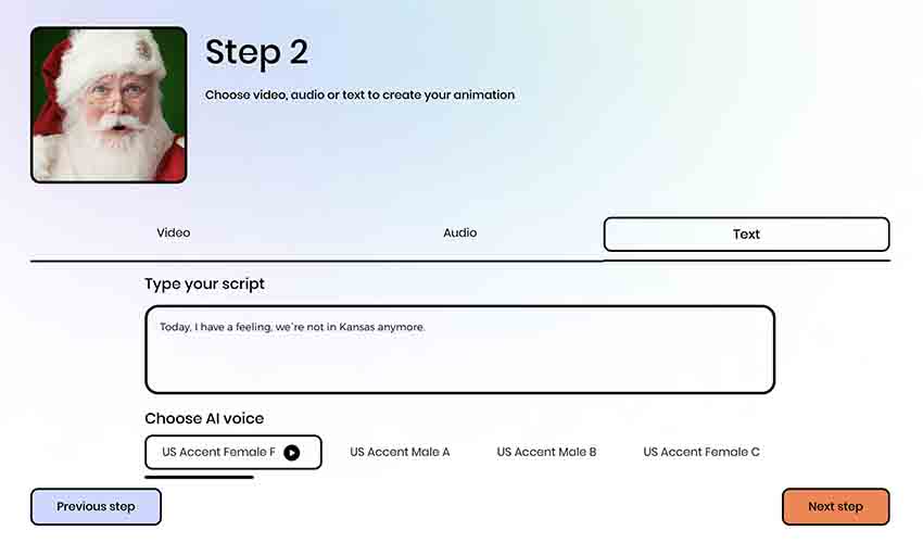 Next step 버튼을 누르면 이제 비디오 또는 오디오 또는 택스트로 캐릭터가 하고 싶은 말을 하게 정할 수 있습니다.