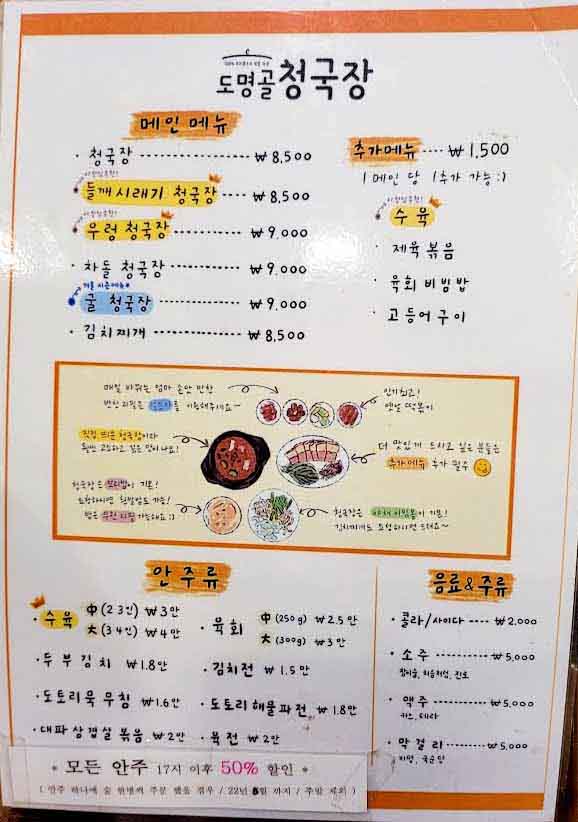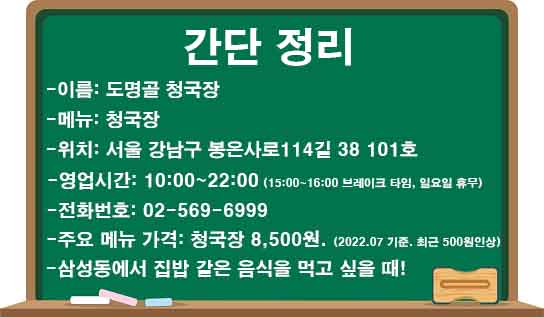 맛이 괜찮다는 추천이 많아, 삼성동에 있는 도명골 청국장에 갔습니다.