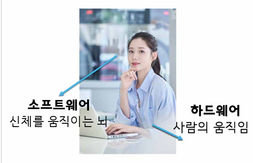 다음 사람을 예시로 들어, 소프트웨어가 신체를 움직이는 뇌이고, 하드웨어가 사람의 움직임을 나타낸 다는 것을 설명해줍니다.