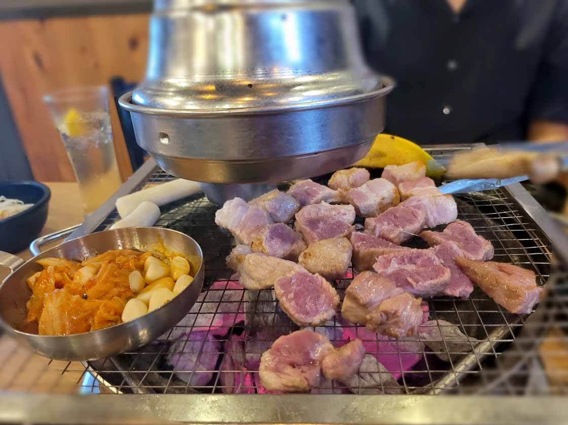 양념장과 김치, 고기를 불에 올려 구워줍니다.