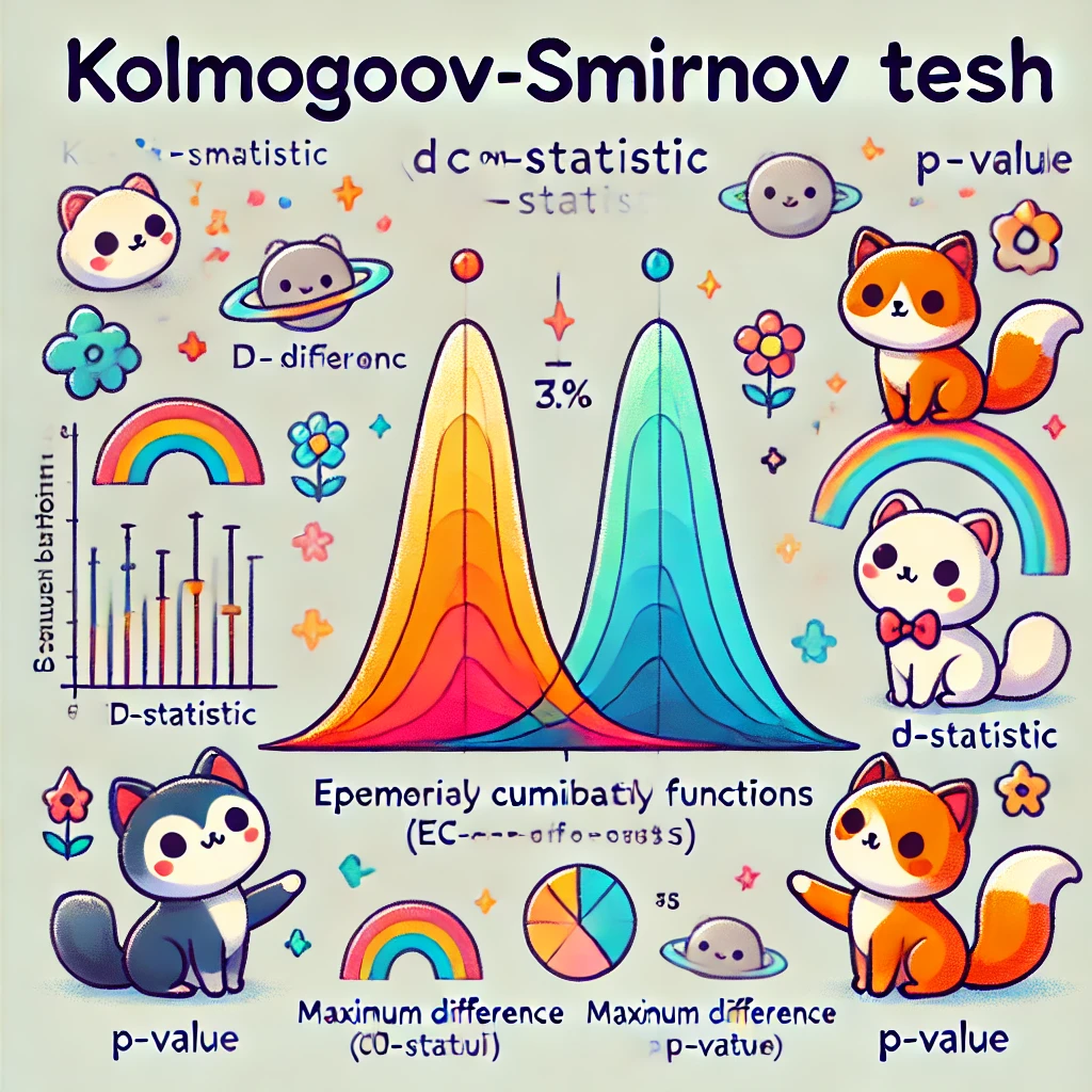 Kolmogorov-Smirnov 검정(KS 검정)은 두 개의 누적 분포 함수(CDF)를 비교하여 두 데이터 세트가 동일한 분포를 따르는지 또는 주어진 데이터가 특정 분포(예: 정규 분포)를 따르는지를 평가하는 비모수적 통계 검정입니다. 이 검정은 연속형 변수에 사용되며, 특히