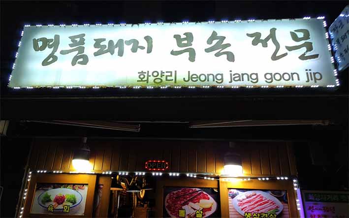 명품돼지 부속 전문이라고 쓰여있고 밑에 화양리 정장군집이라고 쓰여있습니다.