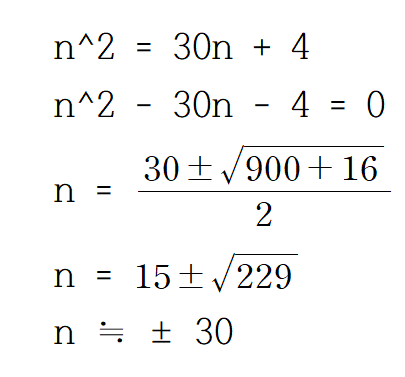13. 두 함수 30n + 4와 n^2를 여러 가지 n 값으로 비교하라. 언제 30n + 4가 n^2보다 작은 값을 갖는지를 구하라. 그래프를 그려보라.