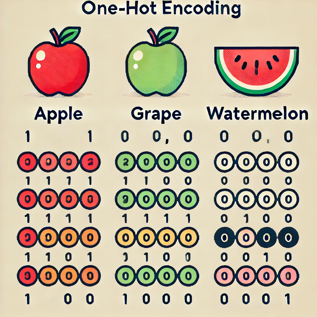 One-Hot Encoding은 주어진 범주 중 하나를 컴퓨터가 이해할 수 있는 0과 1로 이루어진 벡터로 변환하는 방법입니다. 변환된 벡터에서 해당하는 범주만 1로 표시되고, 나머지는 모두 0이 됩니다.