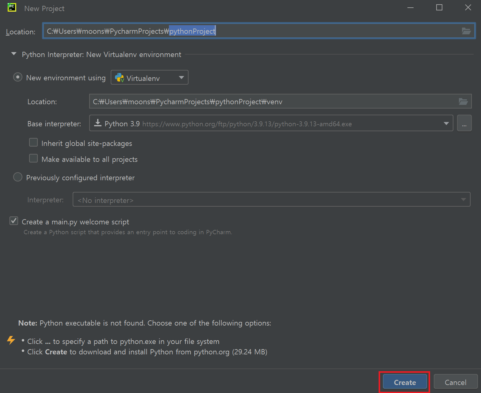 파이참에는 기본적으로 파이썬이 포함되어 있지 않기 때문에 미리 파이썬을 설치하는 것을 추천드립니다.